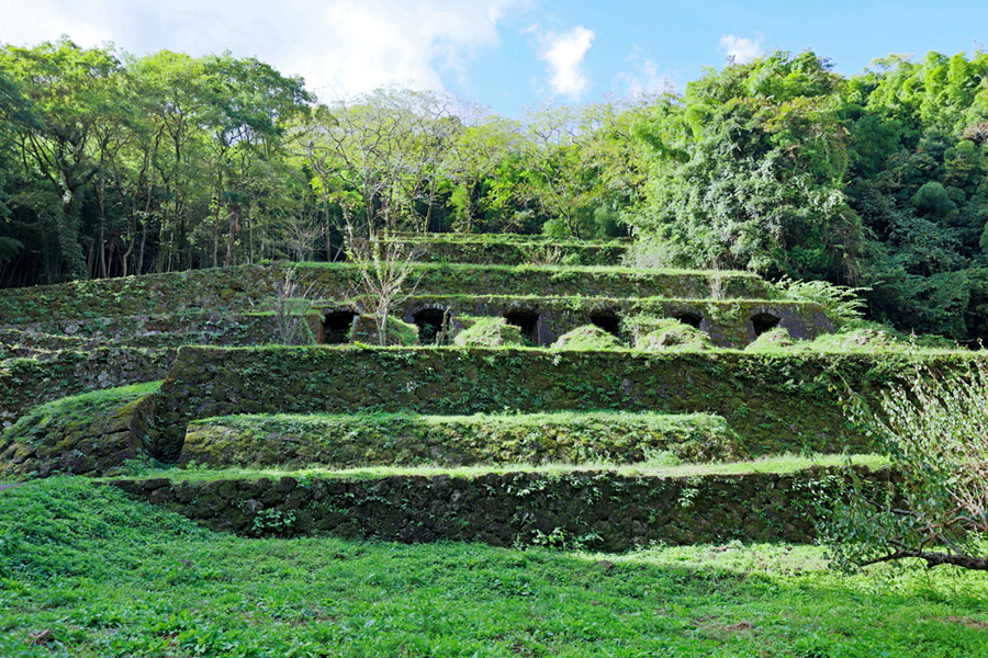 山すそに傾斜を利用して造られた明治時代の先端技術による製錬所の遺跡。